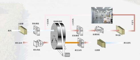 轉輪除濕機的工作流程可分幾個部分完成:預冷 / 預熱( 供選件 ) — 轉輪除濕 —后冷 / 后熱( 供選件 )