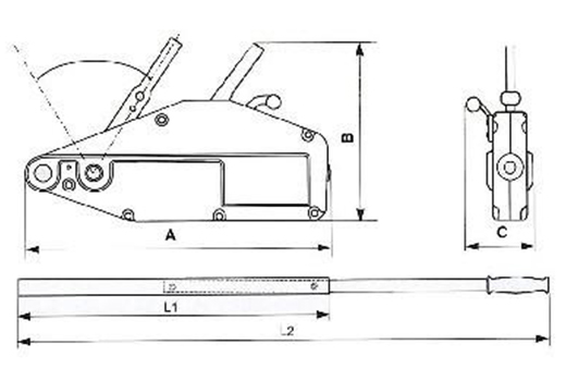 額定起重量(KG) | 額定收拉力N | 額定前進(jìn)行程 | 鋼絲繩直徑(mm) | 鋼絲繩安全系數(shù) | 整機安全系數(shù) | 最大載荷(KG) | 整機重量(KG) | 整機尺寸 | L1(mm) | L2(mm) | ||||||